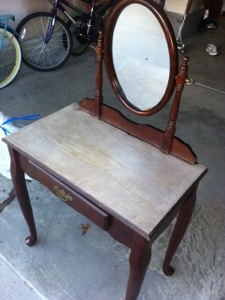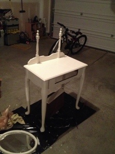 So I started on the vanity. Which costs me $15.00 at the local Goodwill. Originally I thought it would look nice in my bedroom, but the roommate (hubby) said no. So I sanded down the top because it had cup rings on it and I was only going to restain the wood. Sometime during my trip to Home Depot, my mind drifted to off white acrylic paint. So I decided to chalk paint the vanity for my granddaughter. Chalk paint is latex paint with Plaster of Paris mixed.